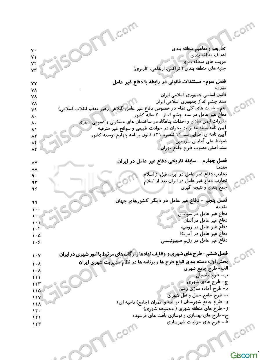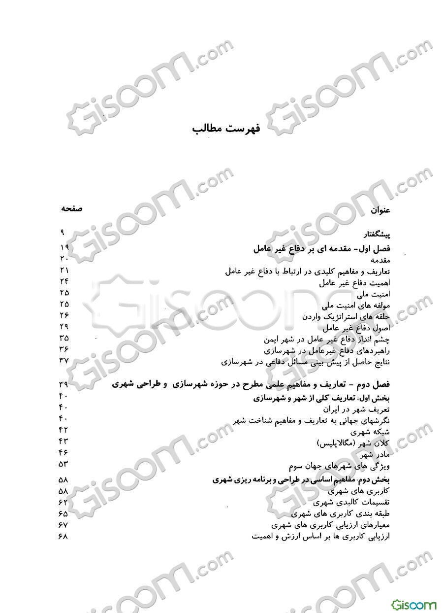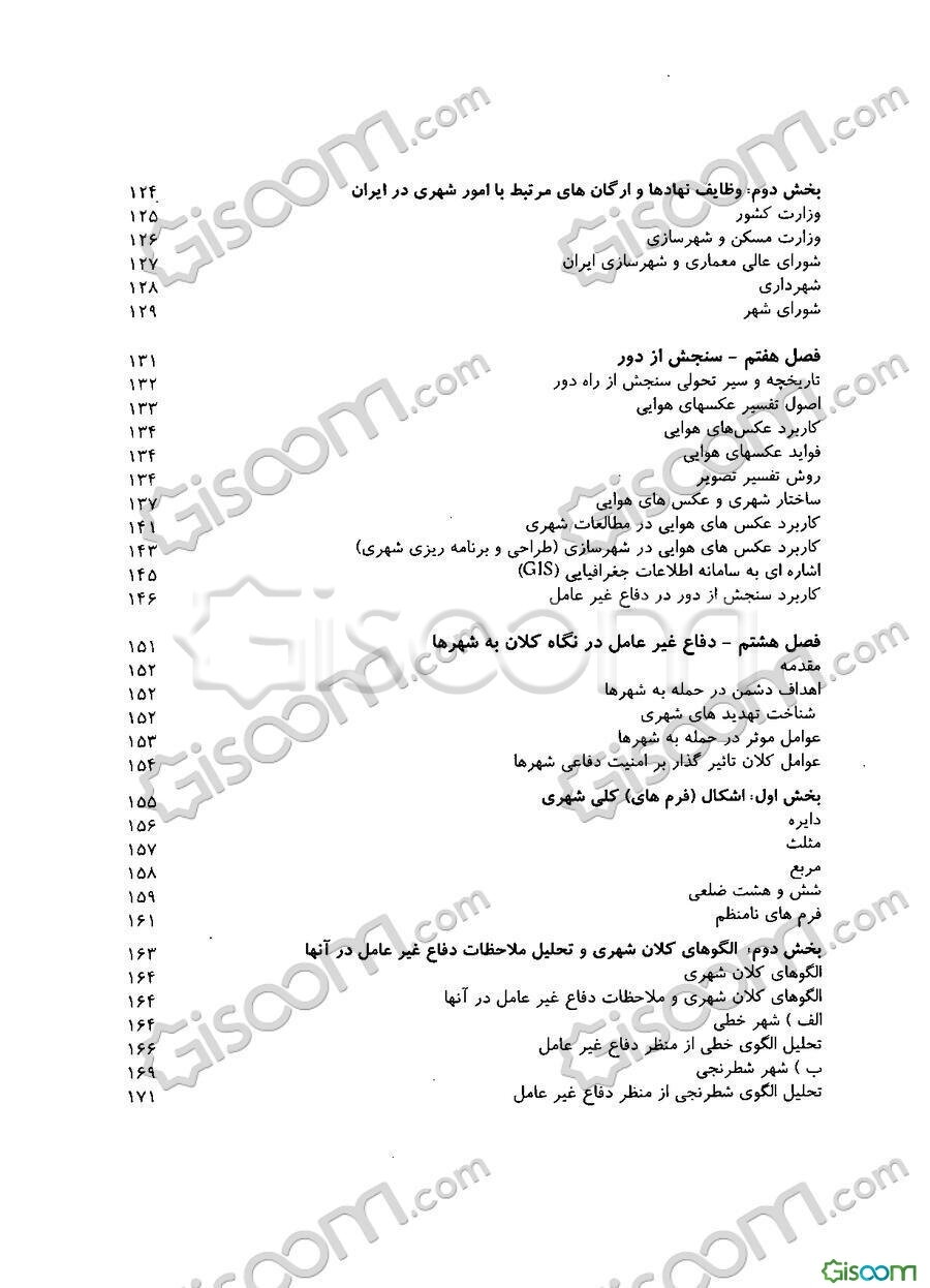 این کتاب به موارد زیر می پردازد: نگاهی به مفهوم شهر و شهرسازی ، کلان شهر و مادر شهر و ویژگی های شهر در جهان سوم ، مفاهیم اساسی در طراحی و برنامه ریزی شهری از جمله کاربری های شهری ، تقسیمات کالبدی شهری، معیارهای ارزیابی کاربری های شهری ؛ سابقه دفاع غیر عامل در ایران با تقسیم آن به دوره قبل از اسلام و بعد از اسلام ، دفاع غیر عامل در کشورهای ؛ انواع طرح های شهری مربوط به امور شهری ازجمله طرح جامع شهری، طرح تفضیلی، طرح هادی شهری و…و وظایف هر کدام از ارگانها نسبت به دفاع غیرعامل , دفاع غیرعامل در کلان شهرها ؛کاربری های شهری و نحوه توزیع آنان اختصاص داده شده تا با اختصاص دادن بهترین مکان ها در شهر به این کاربریها ؛ امنیت ساکنان نیز بدست آید.