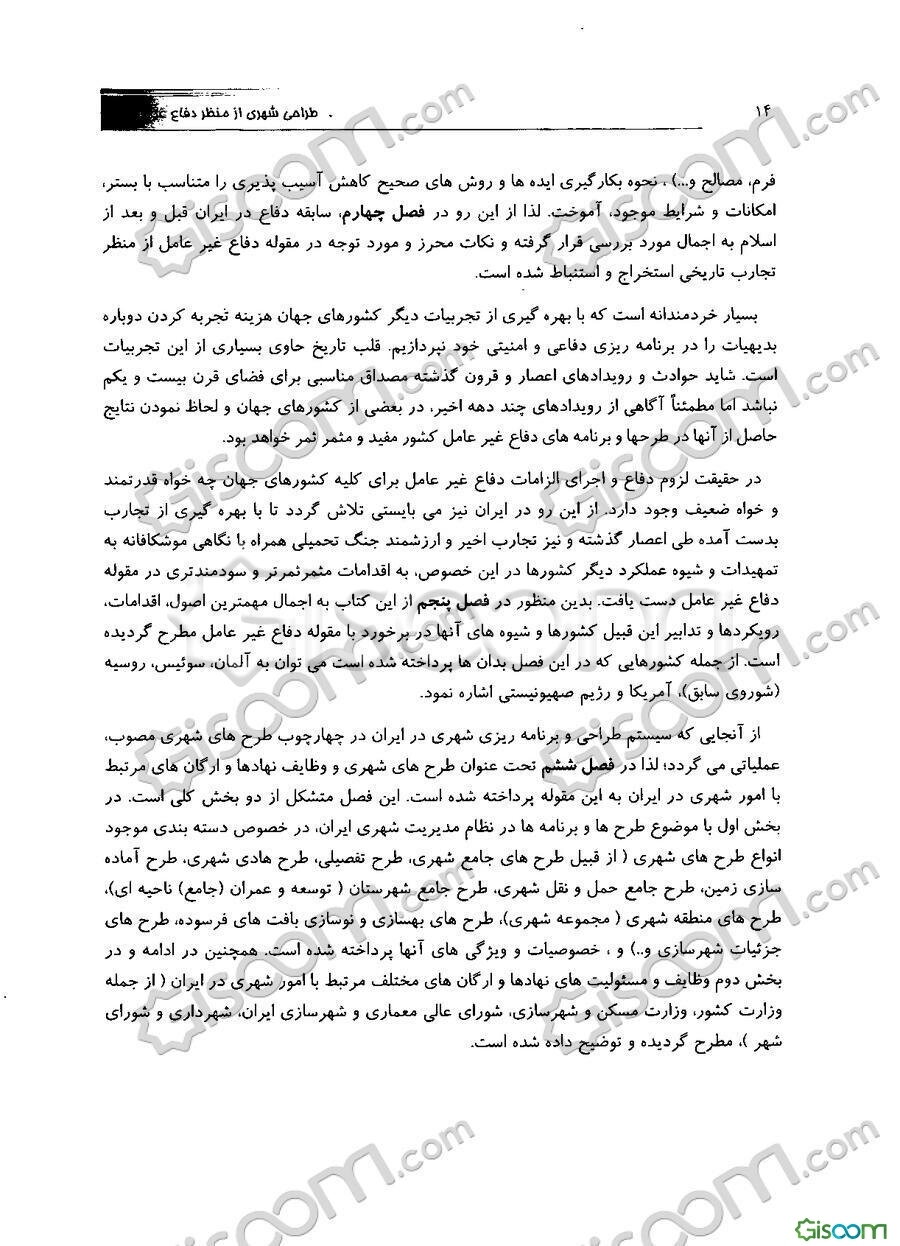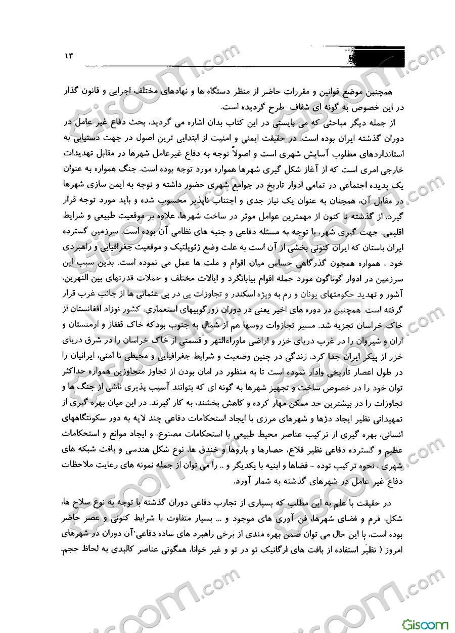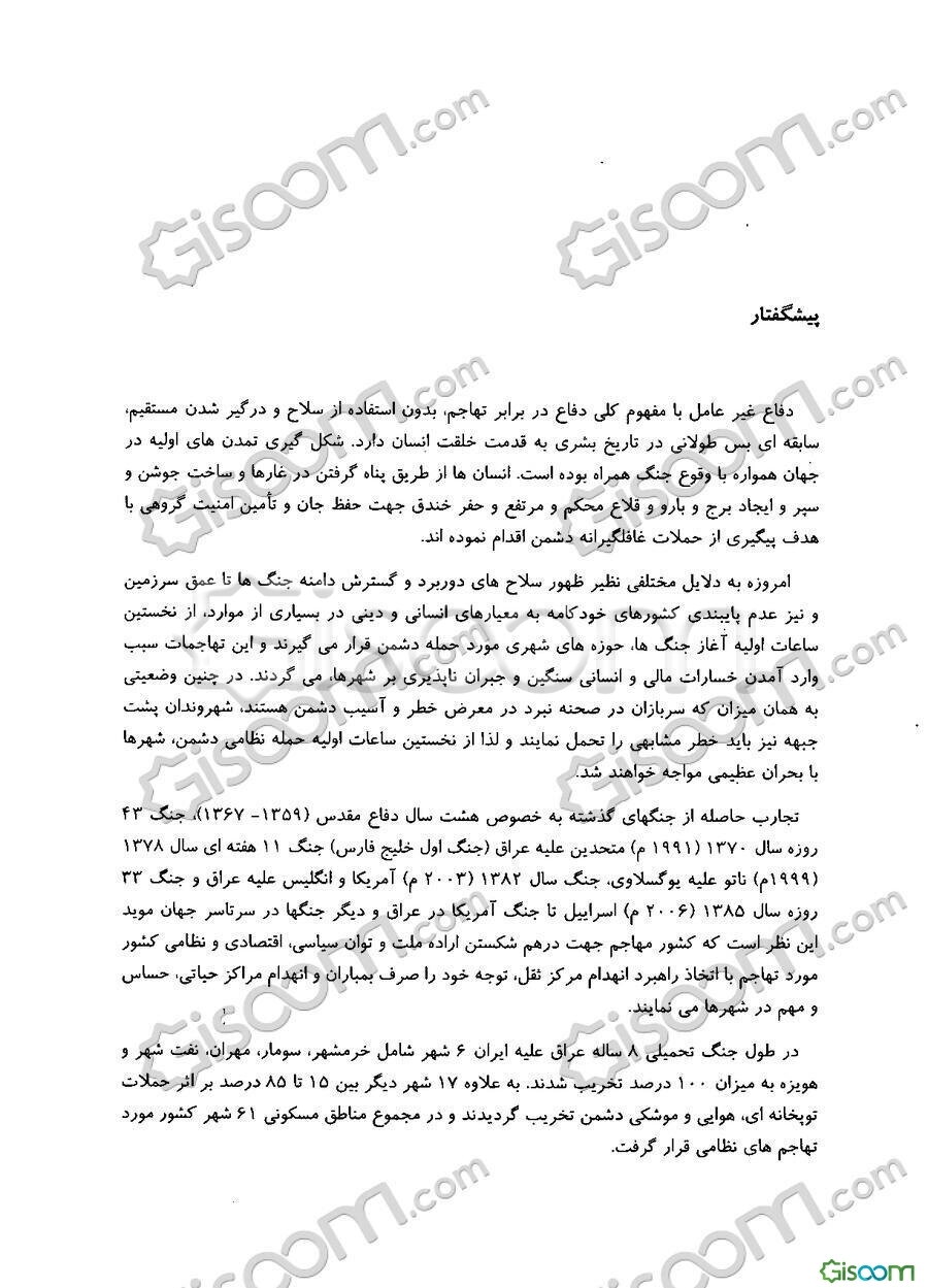 فرم، مصالح و…) ، نحوه بکارگیری ایده ها و روش های صحیح کاهش آسیب پذیری را متناسب با بستر، امکانات و شرایط موجود، آموخت. لذا از این رو در فصل چهارم، سابقه دفاع در ایران قبل و بعد از اسلام به اجمال مورد بررسی قرار گرفته و نکات محرز و مورد توجه در مقوله دفاع غیر عامل از منظر تجارب تاریخی استخراج و استنباط شده است.
