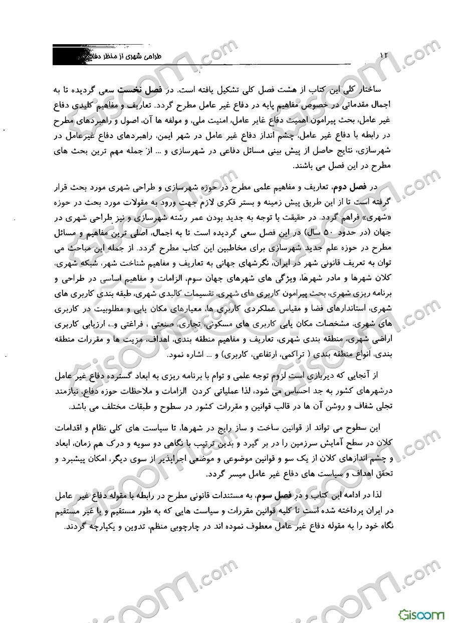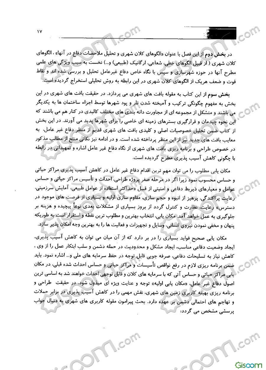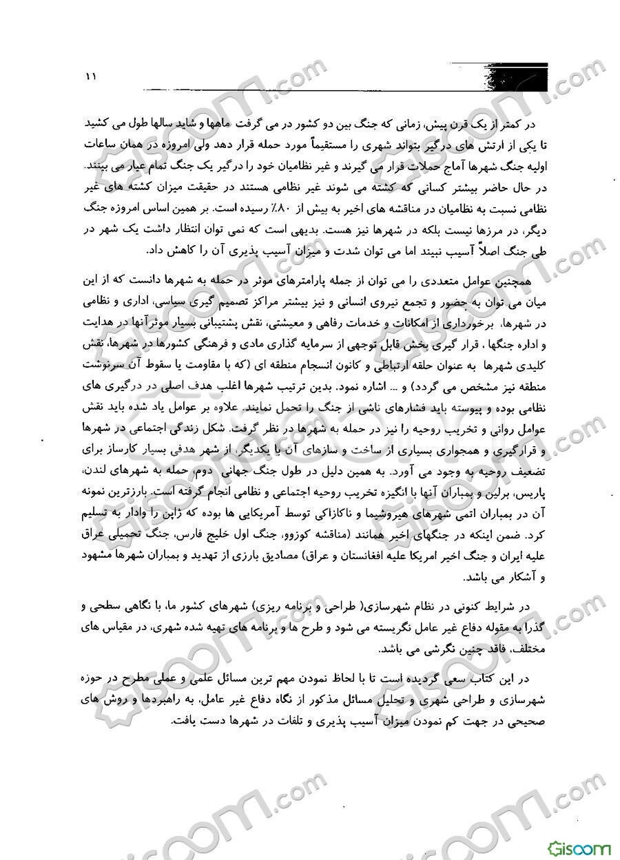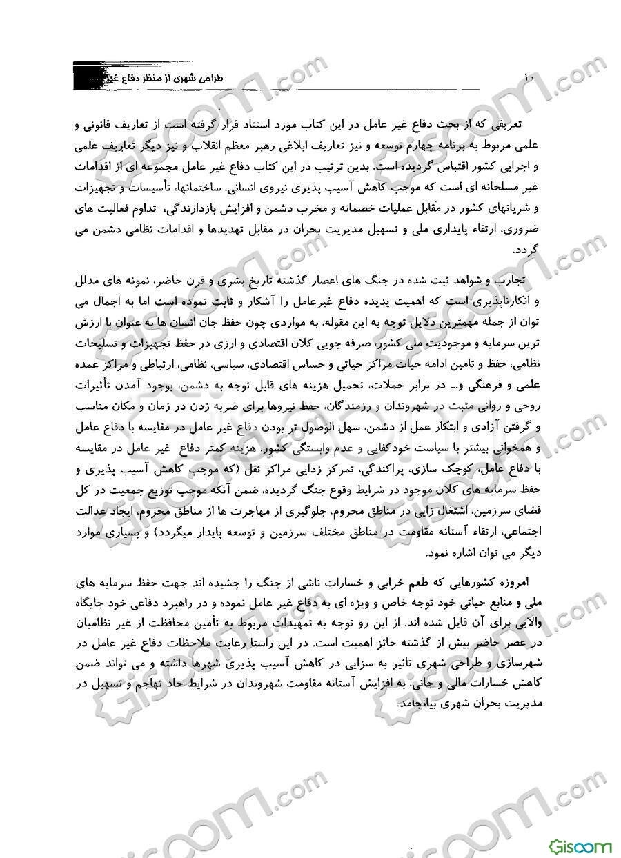فرم، مصالح و…) ، نحوه بکارگیری ایده ها و روش های صحیح کاهش آسیب پذیری را متناسب با بستر، امکانات و شرایط موجود، آموخت. لذا از این رو در فصل چهارم، سابقه دفاع در ایران قبل و بعد از اسلام به اجمال مورد بررسی قرار گرفته و نکات محرز و مورد توجه در مقوله دفاع غیر عامل از منظر تجارب تاریخی استخراج و استنباط شده است.