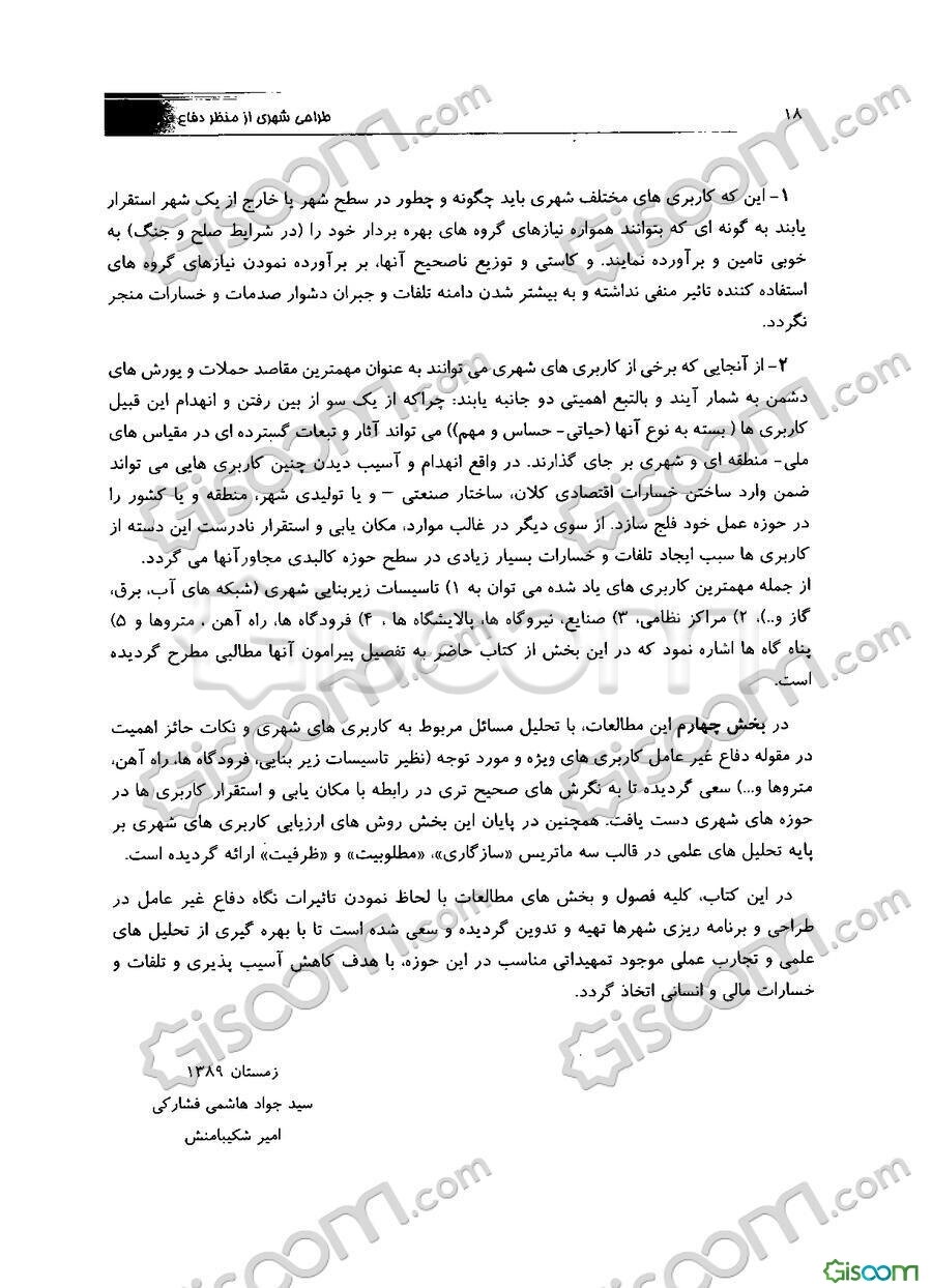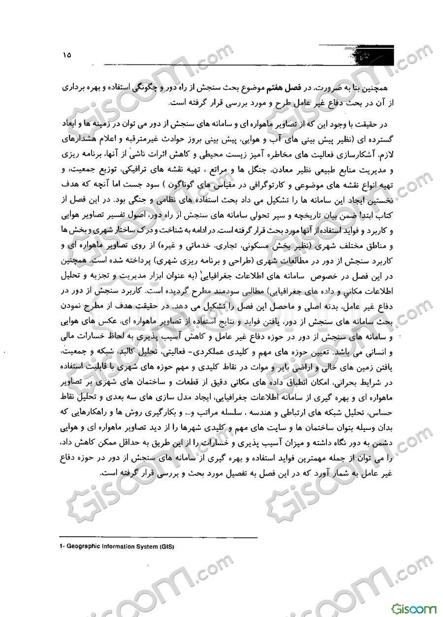 در حقیقت با وجود این که از تصاویر ماهواره ای و سامانه های سنجش از دور می توان در زمینه ها و ابعاد گسترده ای (نظیر پیش بینی های آب و هوایی، پیش بینی بروز حوادث غیرمترقبه و اعلام هشدارهای لازم، آشکارسازی فعالیت های مخاطره آمیز زیست محیطی و کاهش اثرات ناشی از آنها، برنامه ریزی و مدیریت منابع طبیعی نظیر معادن، جنگل ها و مراتع ، تهیه نقشه های ترافیکی، توزیع جمعیت، و تهیه انواع نقشه های موضوعی و کارتوگرافی در مقیاس های گوناگون ) سود جست اما آنچه که هدف نخستین ایجاد این سامانه ها را تشکیل می داد بحث استفاده های نظامی و جنگی بود. در این فصل از کتاب ابتدا ضمن بیان تاریخچه و سیر تحولی سامانه های سنجش از راه دور، اصول تفسیر تصاویر هوایی و کاربرد و فواید استفاده از آنها مورد بحث قرار گرفته است. در ادامه به شناخت و درک ساختار شهری و بخش ها و مناطق مختلف شهری (نظیر بخش مسکونی، تجاری، خدماتی و غیره) از روی تصاویر ماهواره ای و کاربرد سنجش از دور در مطالعات شهری (طراحی و برنامه ریزی شهری) پرداخته شده است. همچنین در این فصل در خصوص سامانه های اطلاعات جغرافیایی (به عنوان ابزار مديريت و تجزيه و تحليل اطلاعات مکانى و داده های جغرافیایی) مطالبی سودمند مطرح گردیده است. کاربرد سنجش از دور در دفاع غیر عامل، بدنه اصلی و ماحصل این فصل را تشکیل می دهد. در حقیقت هدف از مطرح نمودن بحث سامانه های سنجش از دور، یافتن فواید و نتایج استفاده از تصاویر ماهواره ای، عکس های هوایی و سامانه های سنجش از دور در حوزه دفاع غیر عامل و کاهش آسیب پذیری به لحاظ خسارات مالی و انسانی می باشد. تعیین حوزه های مهم و کلیدی عملکردی- فعالیتی، تحلیل کالبد، شبکه و جمعیت، یافتن زمین های خالی و اراضی بایر و موات در نقاط کلیدی و مهم حوزه های شهری با قابلیت استفاده در شرایط بحرانی، امکان انطباق داده های مکانی دقیق از قطعات و ساختمان های شهری بر تصاویر ماهواره ای و بهره گیری از سامانه اطلاعات جغرافیایی، ایجاد مدل سازی های سه بعدی و تحلیل نقاط حساس، تحلیل شبکه های ارتباطی و هندسه ، سلسله مراتب و..، و بکارگیری روش ها و راهکارهایی که بدان وسیله بتوان ساختمان ها و سایت های مهم و کلیدی شهرها را از دید تصاویر ماهواره ای و هوایی دشمن به دور نگاه داشته و میزان آسیب پذیری و خسارات را از این طریق به حداقل ممکن کاهش داد، را می توان از جمله مهمترین فواید استفاده و بهره گیری از سامانه های سنجش از دور در حوزه دفاع غیر عامل به شمار آورد که در این فصل به تفصیل مورد بحث و بررسی قرار گرفته است.