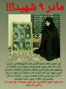 ? خانم صفیه گلزاری مادر ۹ شهید (#مادر_ایران ) است که ساکن جزیره هرمز می باشد . شهدای این خانواده در عملیات‌های خیبر ، فتح المبین ، والفجر ۸ ، کربلای ۴ و کربلای ۵ بوده و آخرین شهید نیز دختر اوست که در جنایات آل سعود در سال ۶۶ در حج خونین مکه له شهادت رسید ….